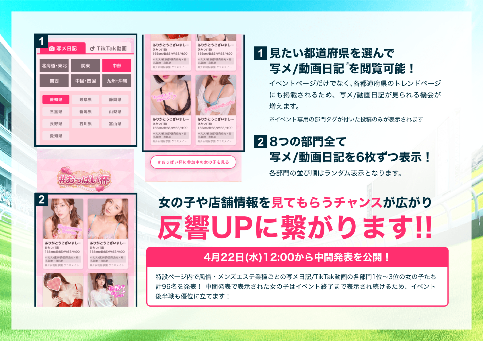 投稿の詳細については、風俗部門とメンズエステ部門に分かれており、それぞれ「#清楚杯」や「#カワイイ杯」といった女の子の個性に合ったジャンルでタグ付けの投稿をして、ユーザーに存在をアピールするというもの。