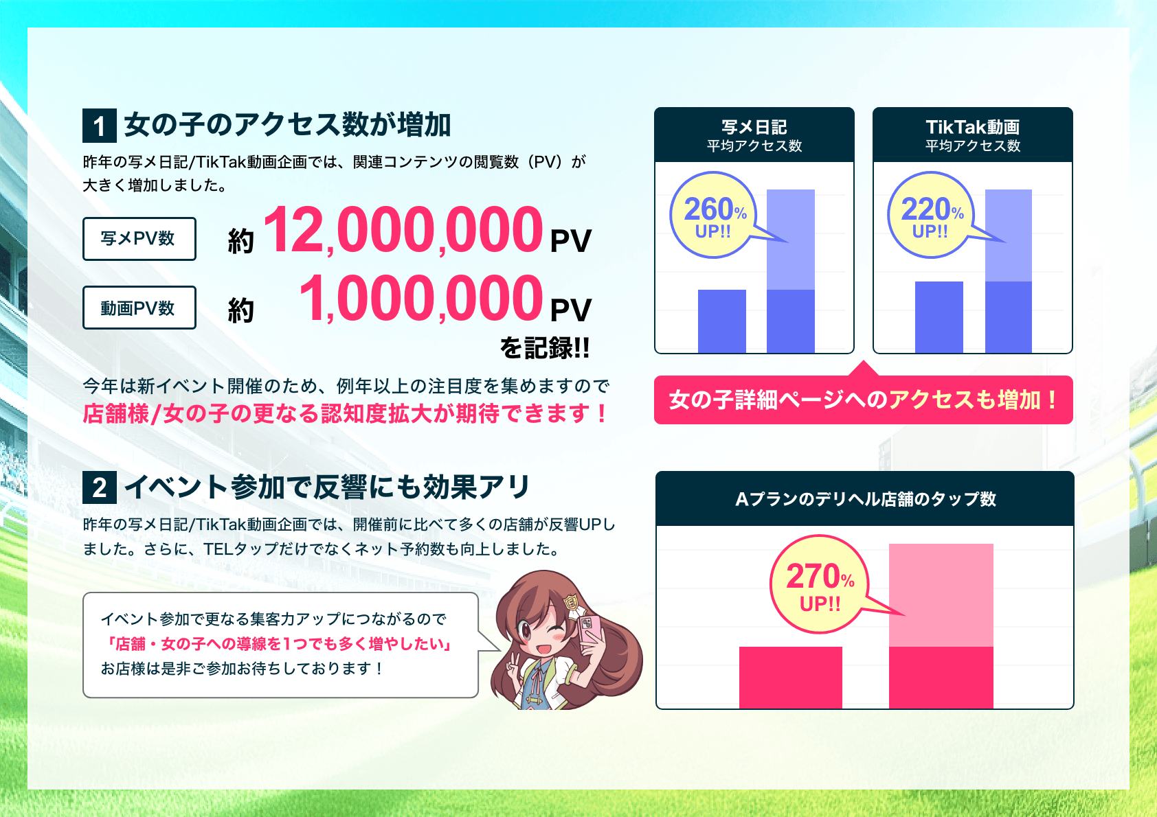 とはいえ、やはり店舗様のご協力や女の子の投稿が非常に重要となっておりますので、ぜひ一致団結してサイト全体でイベントを盛り上げていけたらと考えております。