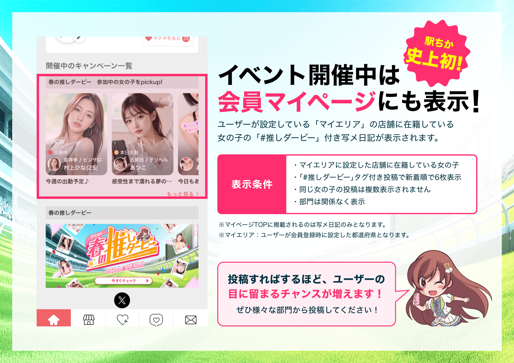 さらに『駅ちか!』初の試みとしてイベント開催中は会員マイページに写メ日記が表示されます。