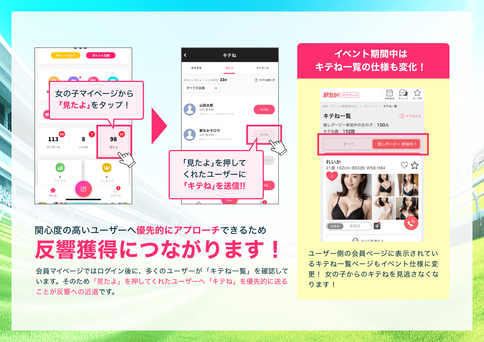 店舗さまの反響獲得、女の子の注目度上昇、ユーザーの満足度アップのため、さまざまな施策を実施!