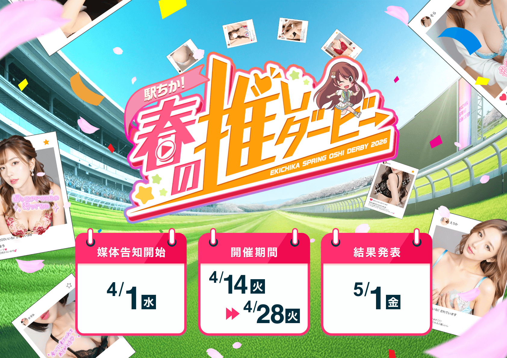 「駅ちか!春の推しダービー」とは、全国・全業種の女の子が写メ日記/TikTak動画を投稿し、ユーザーからの「いいね」や「見たよ」を集めて合計スコアを競って1位を決めるイベントです!