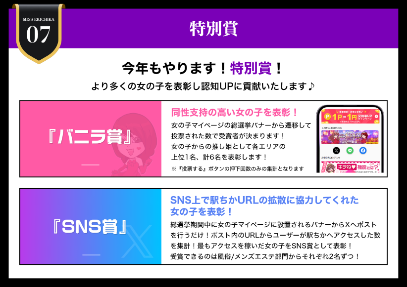 今年は女の子が選ぶ推し姫を各エリア上位1名ずつ表彰する「バニラ賞」、X(旧:Twitter)で駅ちかを拡散してくれた女の子を風俗/メンズエステ部門から2名ずつ表彰する「SNS賞」の2種類です。