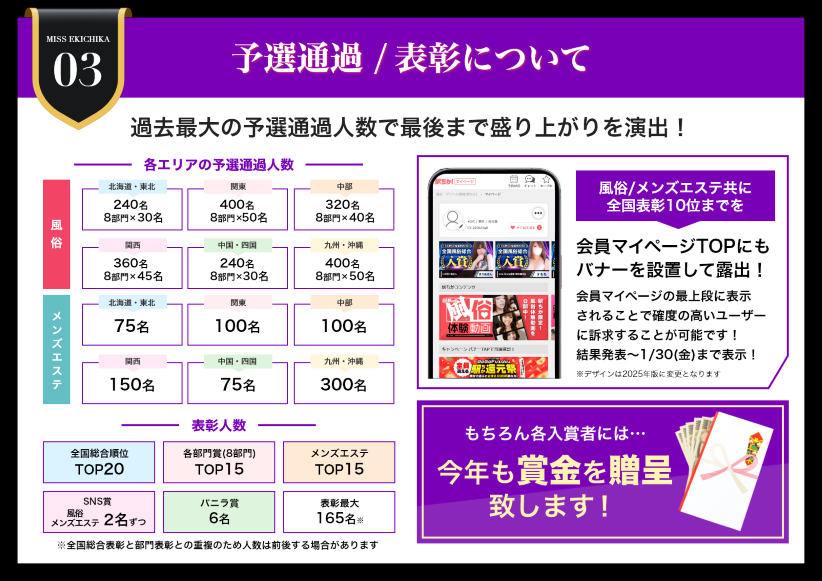 2025年12月12日(金)12:00に結果発表を行い、入賞者には特典として賞金が贈呈されるだけでなく風俗/メンズエステの全国10位までを会員マイページTOPにてバナー設置いたします!