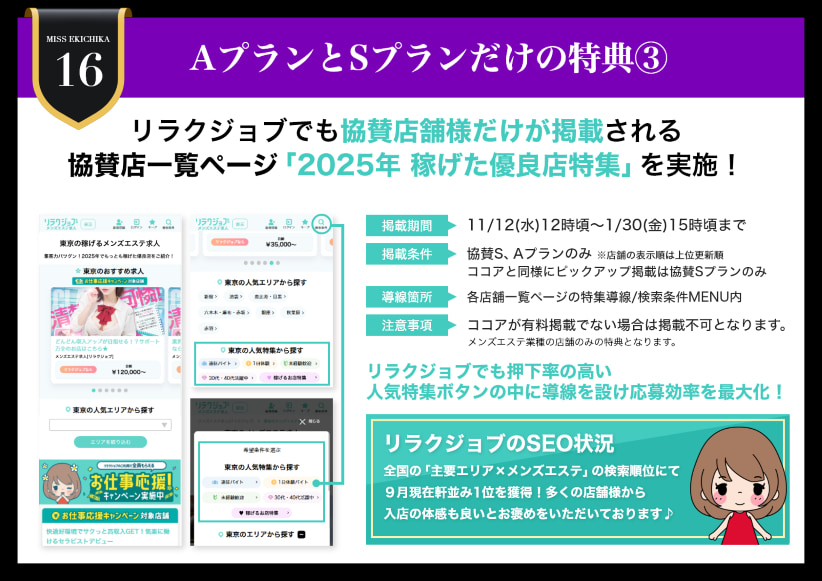 また昨年はなかったリラクジョブへの協賛店一覧ページ掲載「2025年 稼げた優良店特集」も実施されるため、メンズエステ業種の店舗様にもメリットが広がりました。