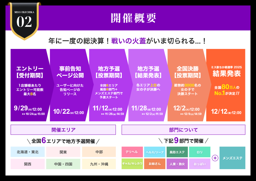 全国決勝進出者を決める地方予選は、全国6エリア・風俗8部門+メンズエステ部門の計9部門に分かれて開催。