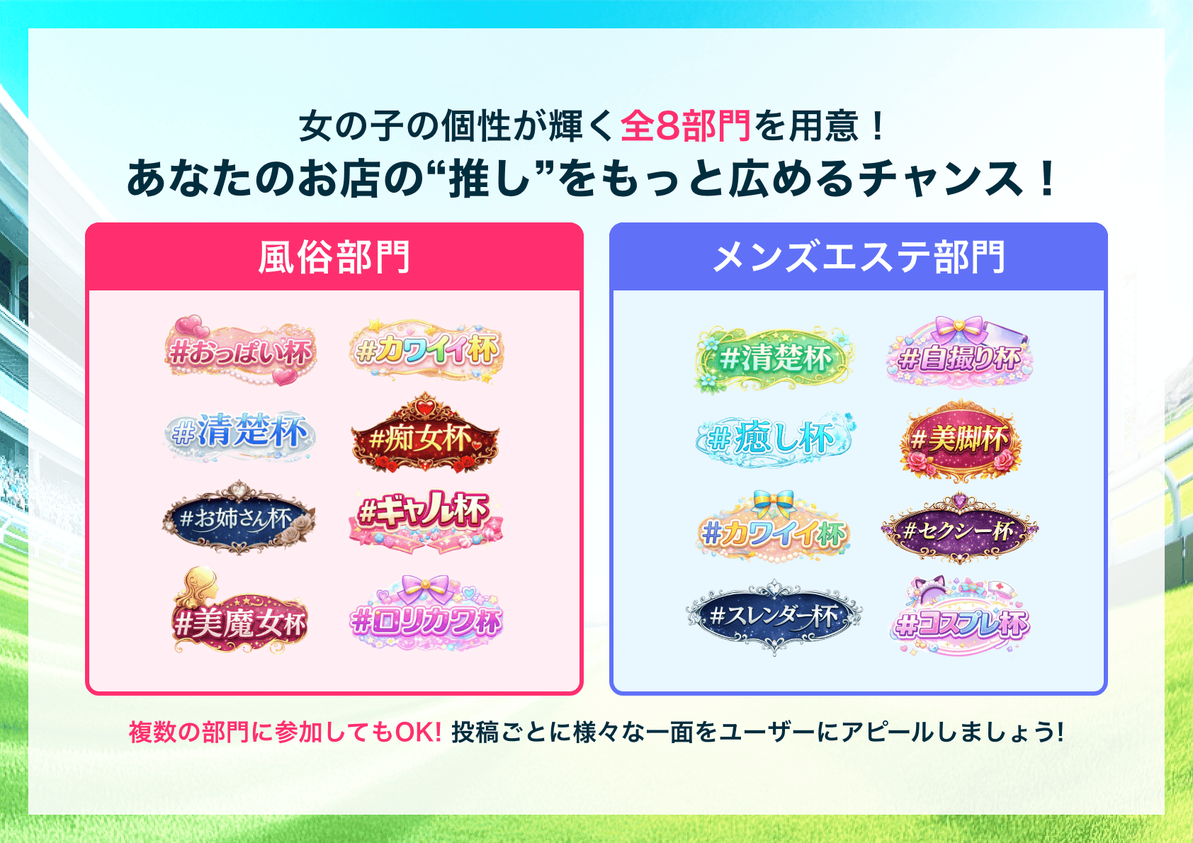 部門は「清楚杯」「カワイイ杯」など、全部で8部門!自分の強みやキャラに合わせて選べるのが特徴です♪