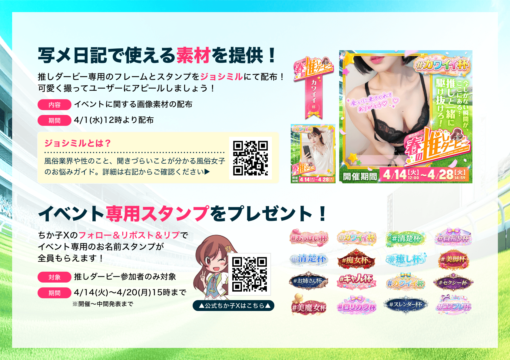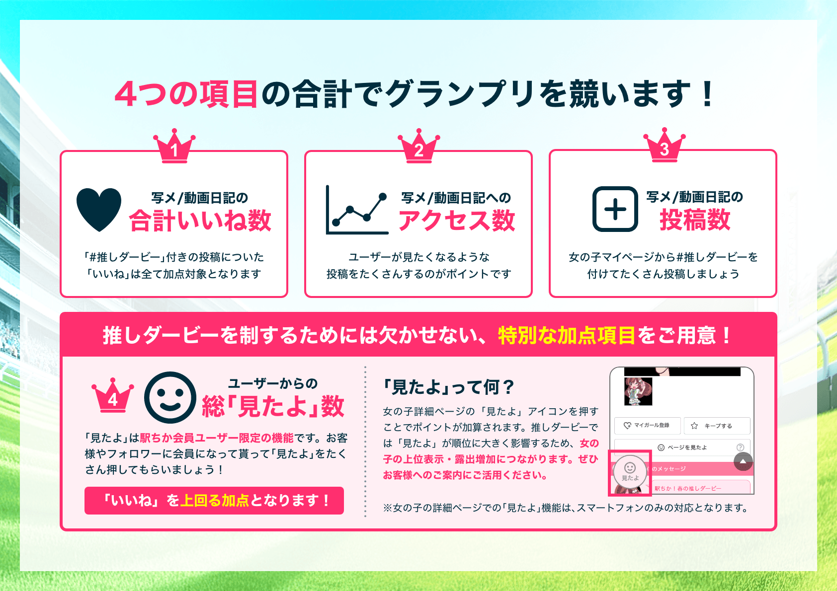 「駅ちか!春の推しダービー」とは、「女の子マイページ」から専用のタグをつけて写メ日記/TikTak動画を投稿して、「いいね」や「見たよ」などの合計スコアを競う応援型イベントです!